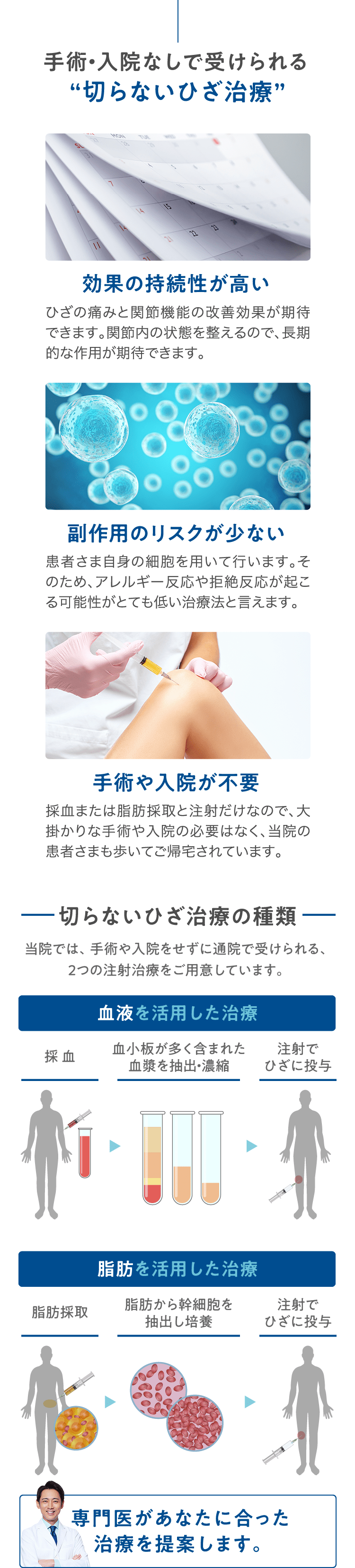 ただし、医療なのでリスクはゼロではありません。注射や移植治療では感染のリスクが伴うため、きちんとした対策の上で行う必要があります。当院では、こうしたリスクを回避する対策をした上で治療を行なっています。 -